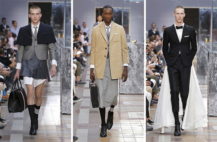 Thom Browne presented his Spring/Summer 2018 men's collection at the Beaux-Arts (National School of Fine Arts) in Paris. The runway was displayed in three showcases, each displaying baby shoes, men's shoes, and heeled shoes. Models appeared wearing skirts and jackets with heeled pumps to the soundtrack of Sally Potter's 1992 film "Orlando" (based on Virginia Woolf's novel). "Orlando" depicts the protagonist, Orlando, reincarnated as a man and a woman through reincarnation, a theme perfectly matched with the image of the models in the collection. Shirt dresses, simple sleeveless dresses, pleated skirts, skin-tight double-breasted sleeveless jackets, and wrap skirts. Designer Thom Browne chose to dress male models in these feminine pieces and had them walk in heeled pumps. It was awkward at times and felt a bit strange, but at the end a model appeared wearing an outfit that was a tuxedo on the front and a wedding dress on the back, and the audience erupted in applause, still excited from the Gay Pride event held the day before.