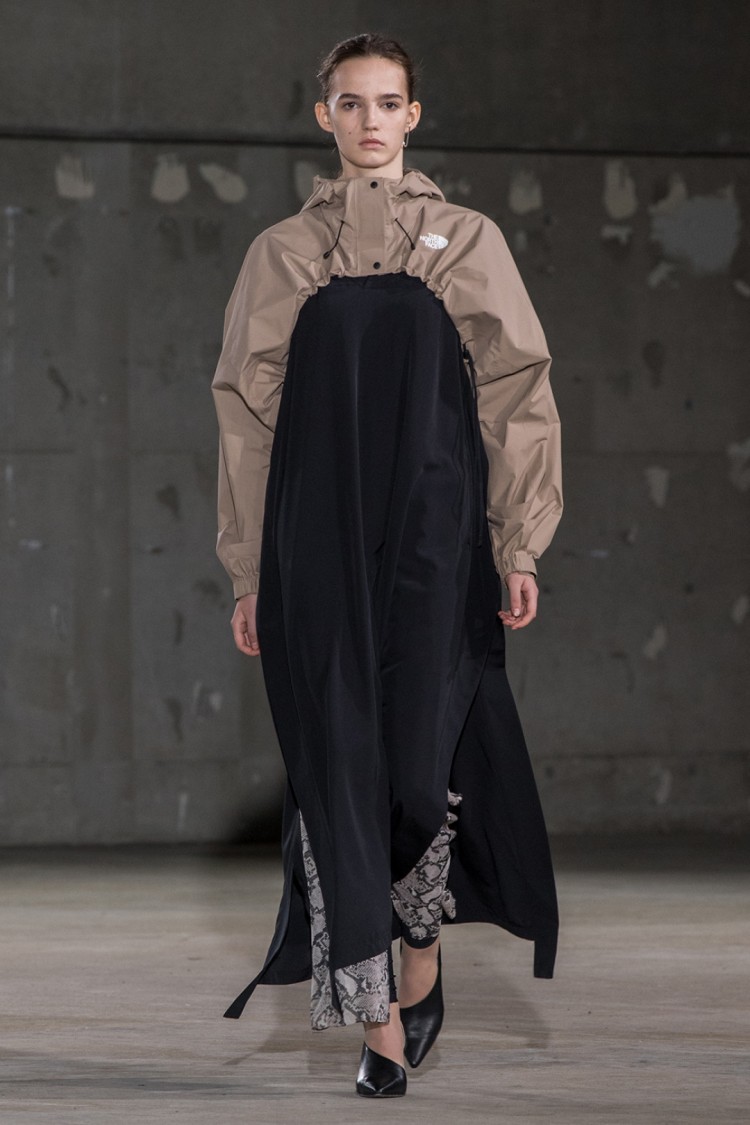 This season's inspiration came from American military items from the 1930s and 1940s, such as the US Navy's 1940s salvage parka, 1930s deck pants, 1940s chambray shirts and stripes, and the US Air Force's M-51 field jacket and field pants. Other designs are inspired by materials and details like the British Army's wrap-around coat from the 1940s and French Army motorcycle pants. While continuing to incorporate elements like boleros, python prints, and wrinkled military designs, adding a classic couture touch, the collection expands its inspiration to include America, the UK, and France. Furthermore, the collection emphasizes change by expanding its design variations with striking colors and patterns that are recognizable from afar, such as vibrant reds and blues, stripes, denim with reversed sides—a style reminiscent of surrealism and the avant-garde—and the trendy asymmetrical designs. Furthermore, the third season of the collaboration with The North Face emphasizes newness and contemporary appeal with asymmetrical designs and logo-emblazoned shoes. The exquisite balance and atmosphere of collars and lengths create a clever collection that blends the originality of HYKE's designs, instantly recognizable as a signature, with the spirit and trends of the times. This time, the brand will also launch its first men's line.
