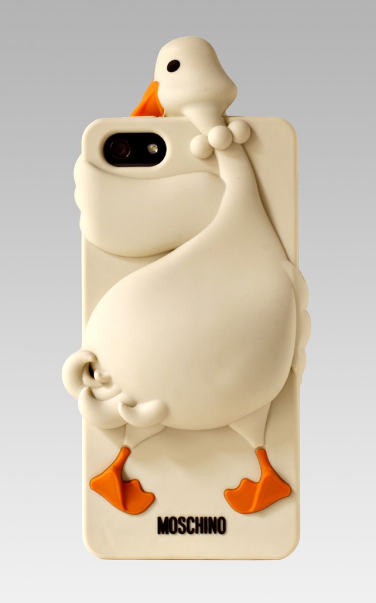 The new "Luisa" case features an adorable three-dimensional design of a goose wearing a pearl necklace and hugging an iPhone. She is the girlfriend of the bear "Gennarino." It is compatible with the iPhone 5. It will be priced at 6,300 yen and will be available in MOSCHINO stores in late February.